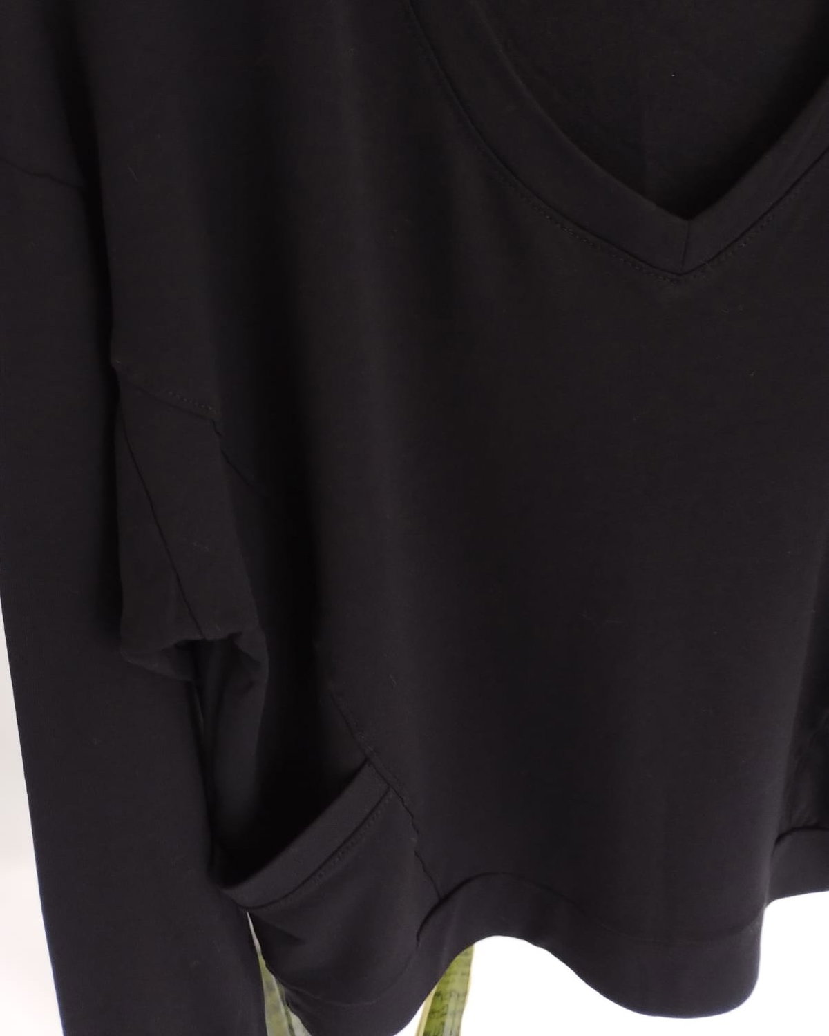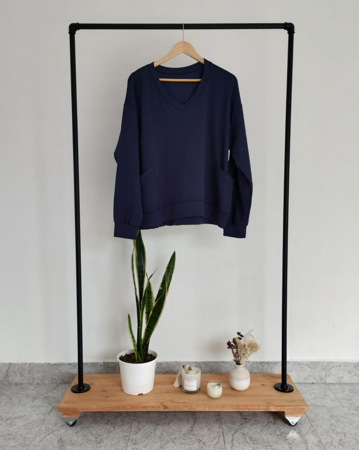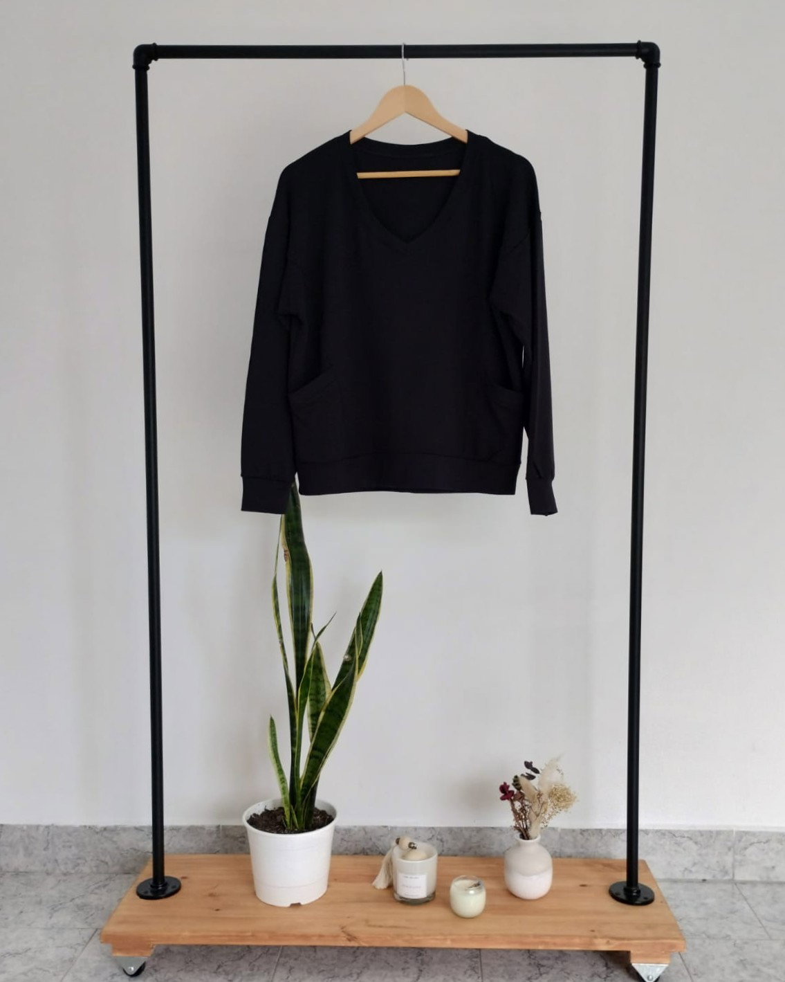 Buzo de algodón frisado con escote V y bolsillos. Disponible en color negro y en azul.