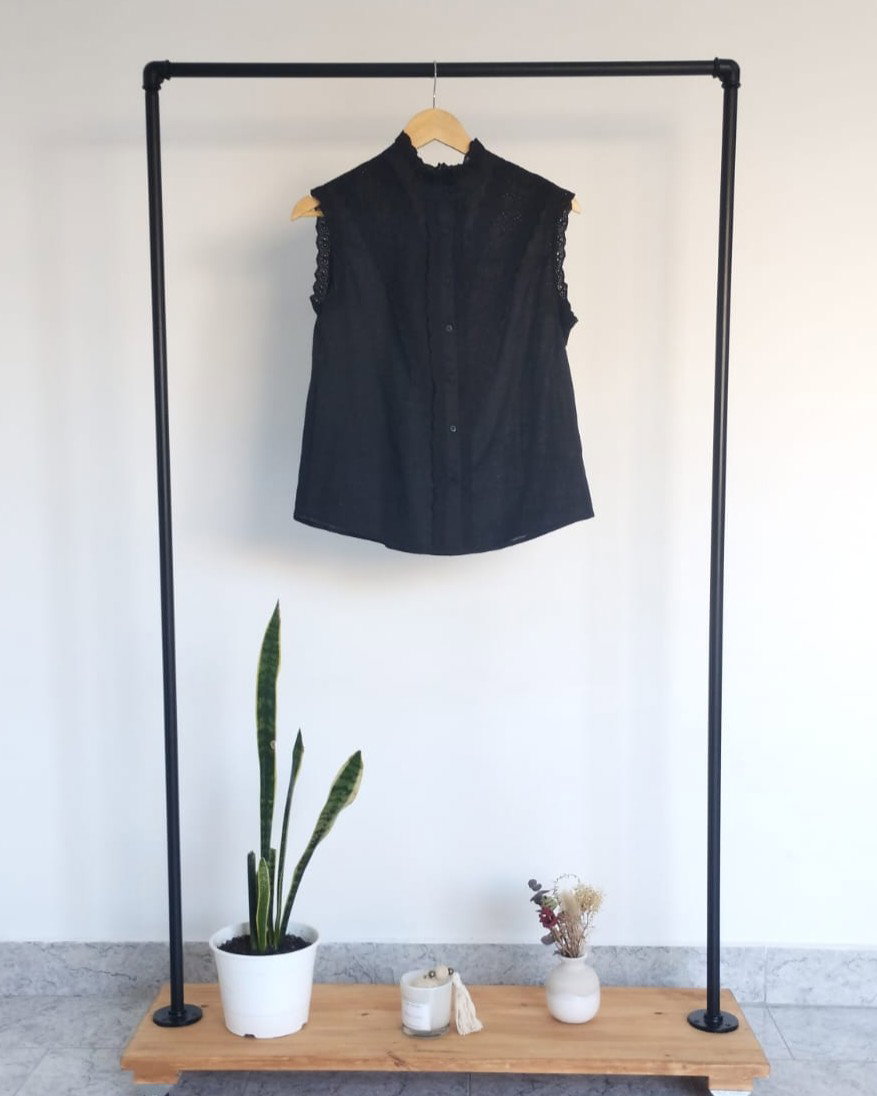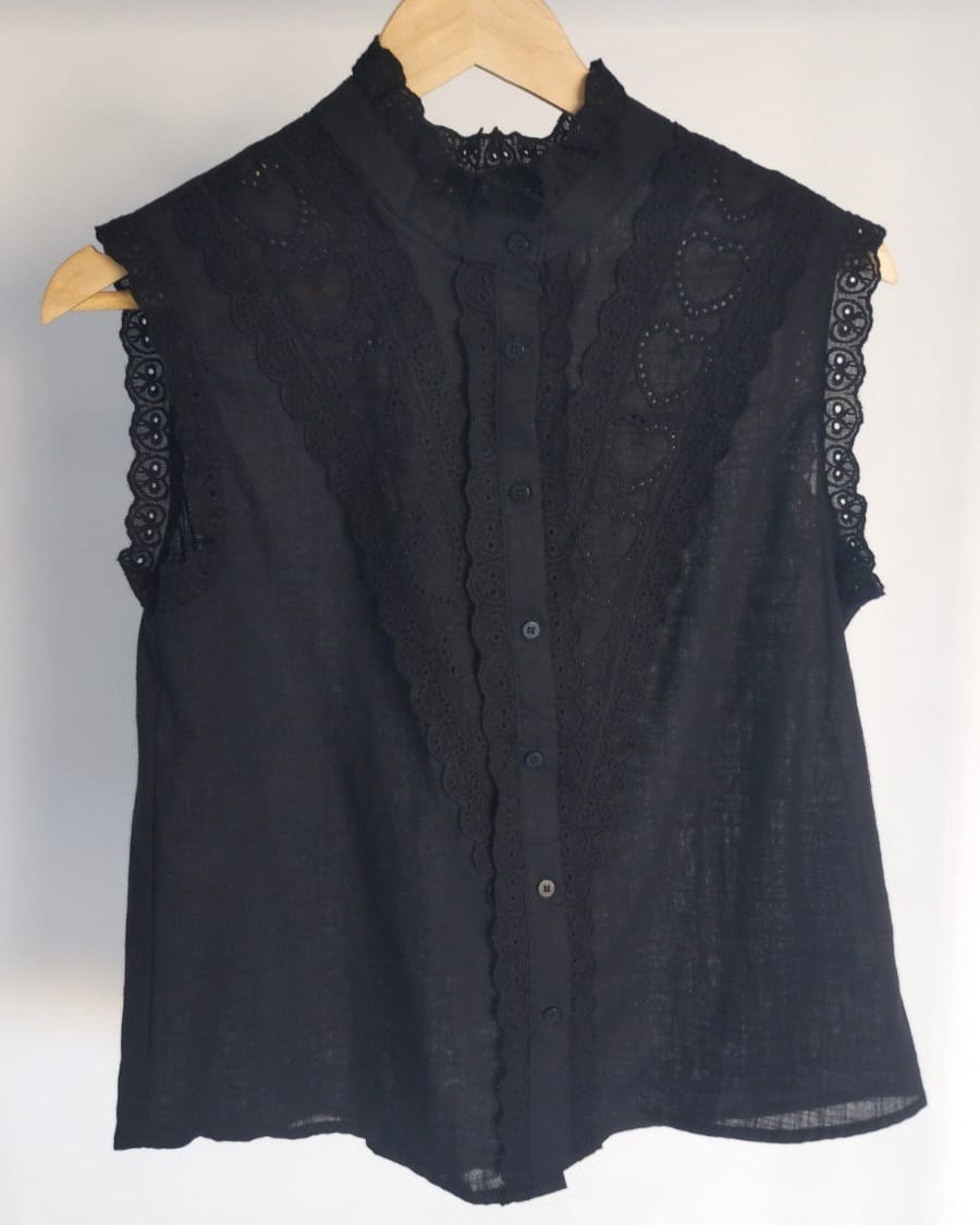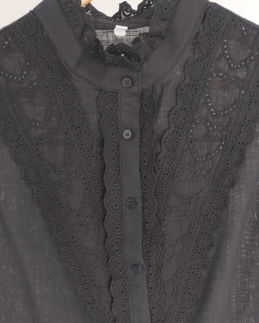 Camisa de algodón con cuello mao y detalles en broderie. Disponible en color negro.