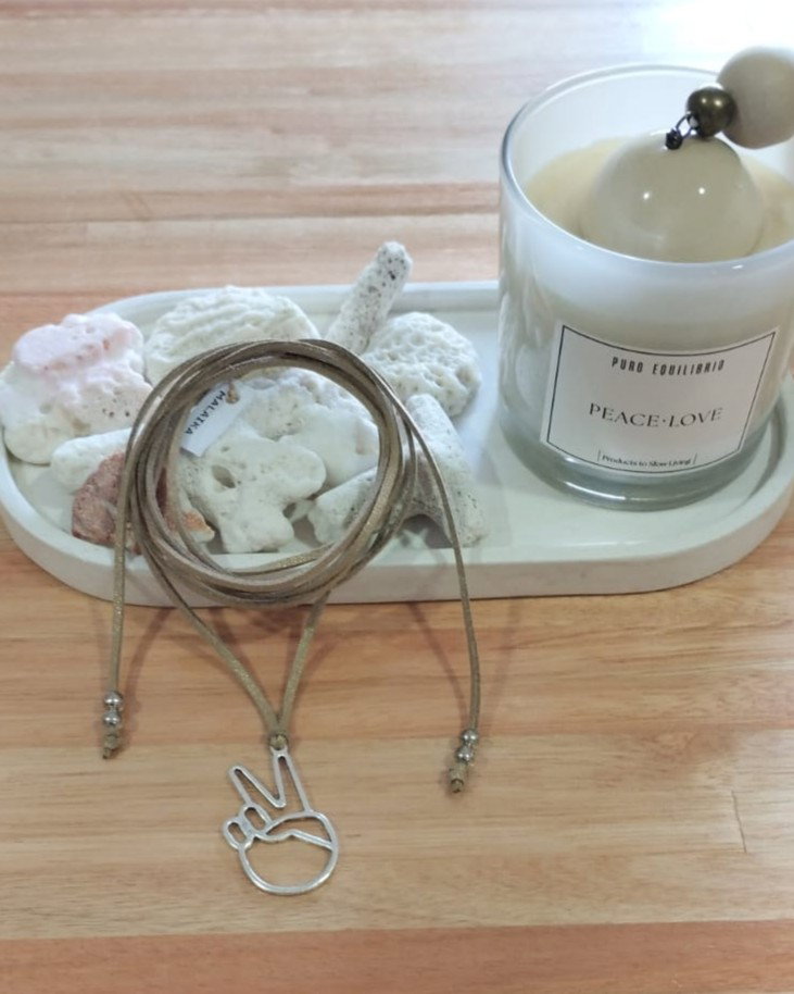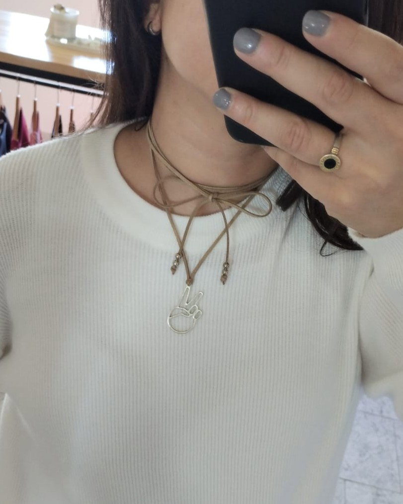 Collar de mútiples vueltas de cordón gamuzado beige con glitter. Dije manito.