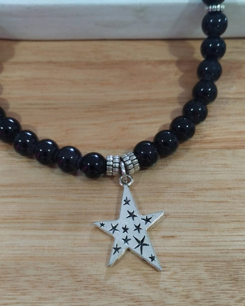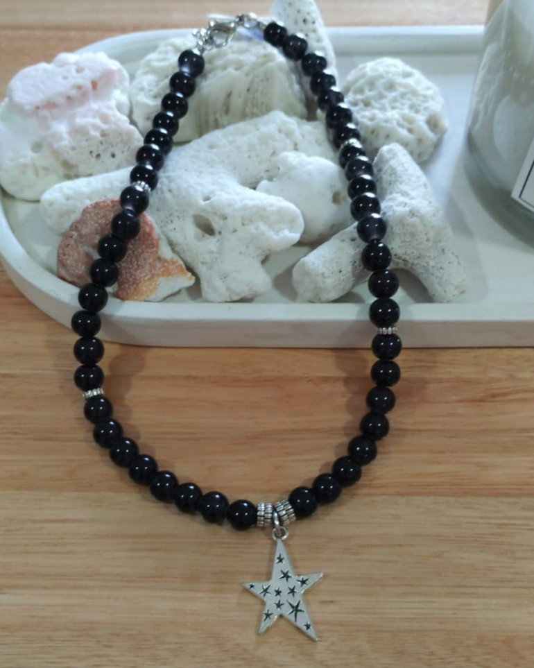 Collar corto de perlas negras de vidrio con dije estrella de zamak. Viene con cadena de alargue.