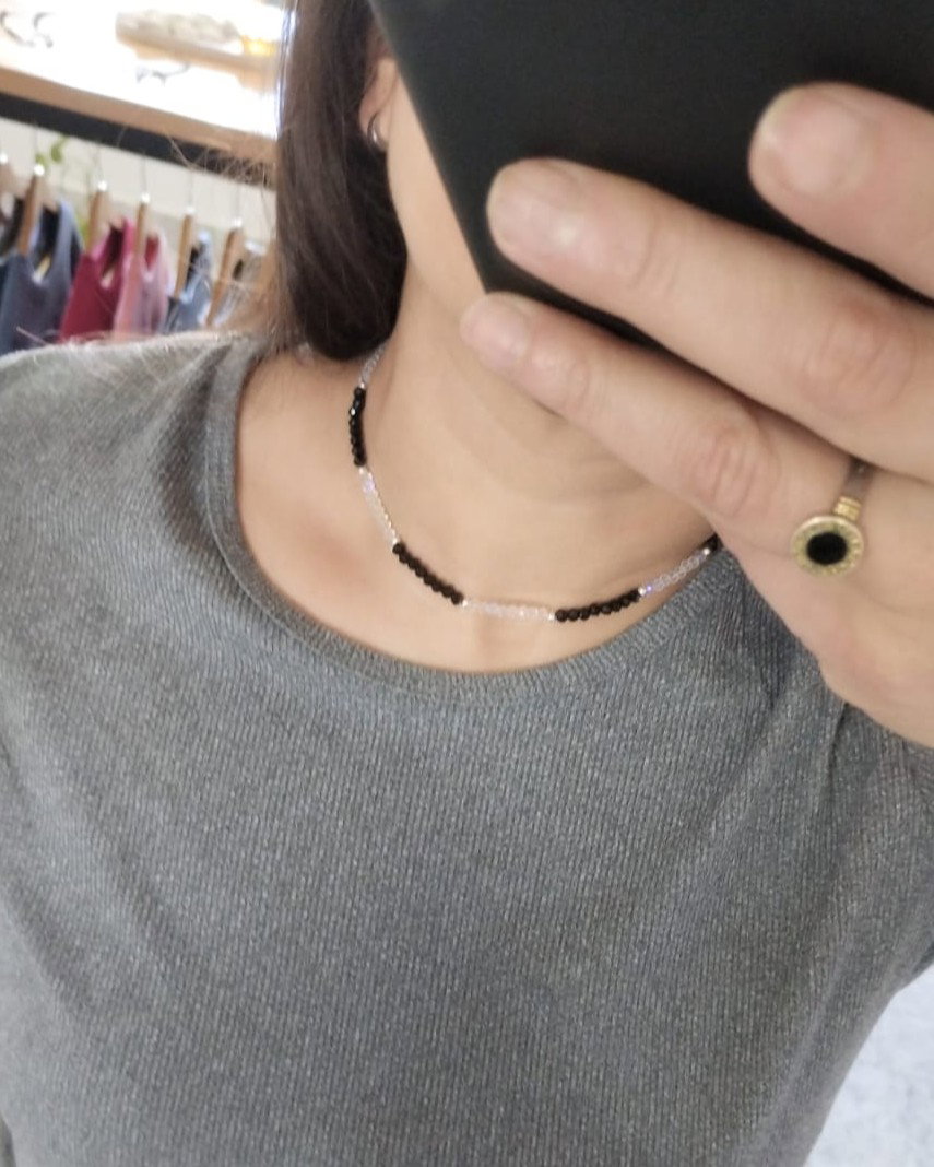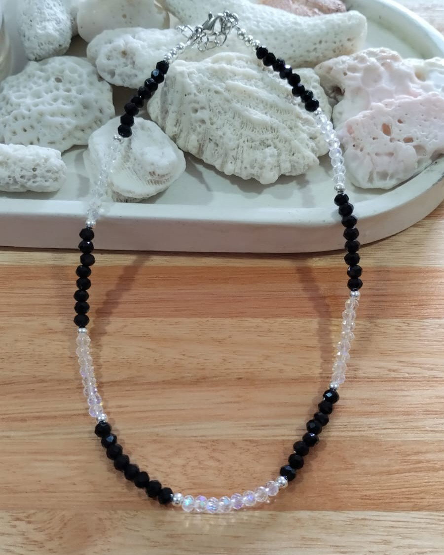 Collar corto de imitación de cristales de roca en color negro y en color transparente tornasolado. Viene con cadena de alargue.