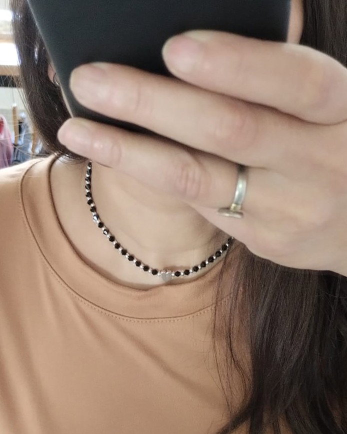 Collar corto de imitación de cristales de roca con dije pasante de corazón en fundición zamak y bolitas plateadas de niquel. Viene con cadena de alargue.