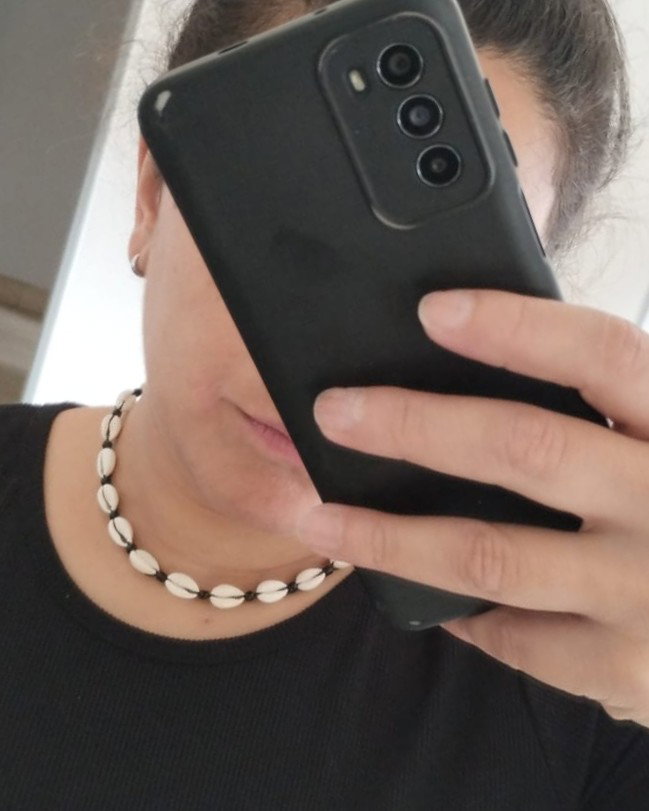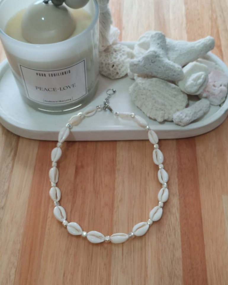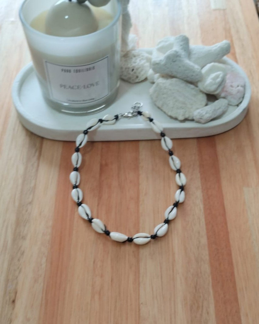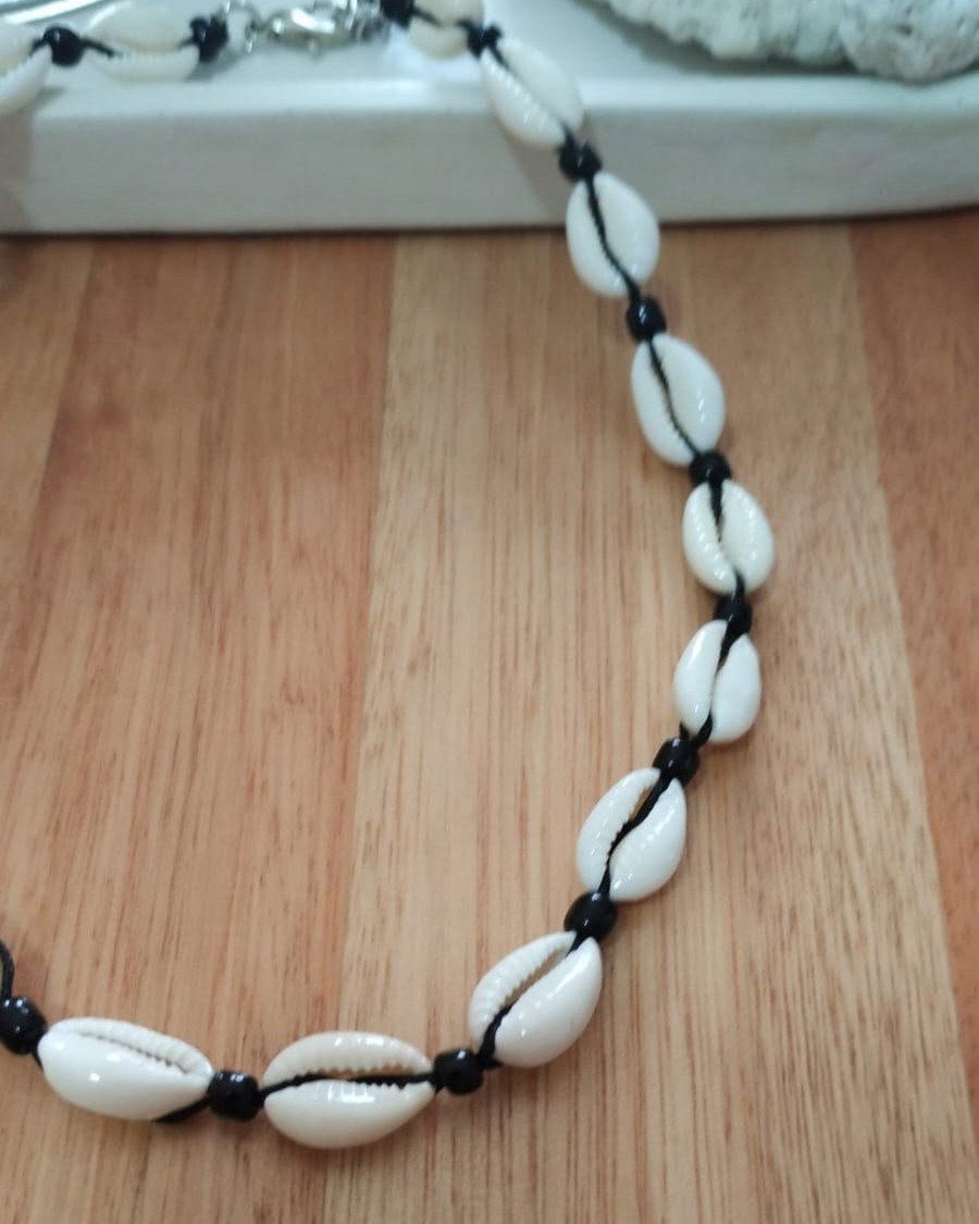 Collar corto de caracoles buzios naturales con hilo chino. Disponible en color blanco y cuentas cuadradas plateadas y en color negro y mostacillas negras. Viene con cadena de alargue.