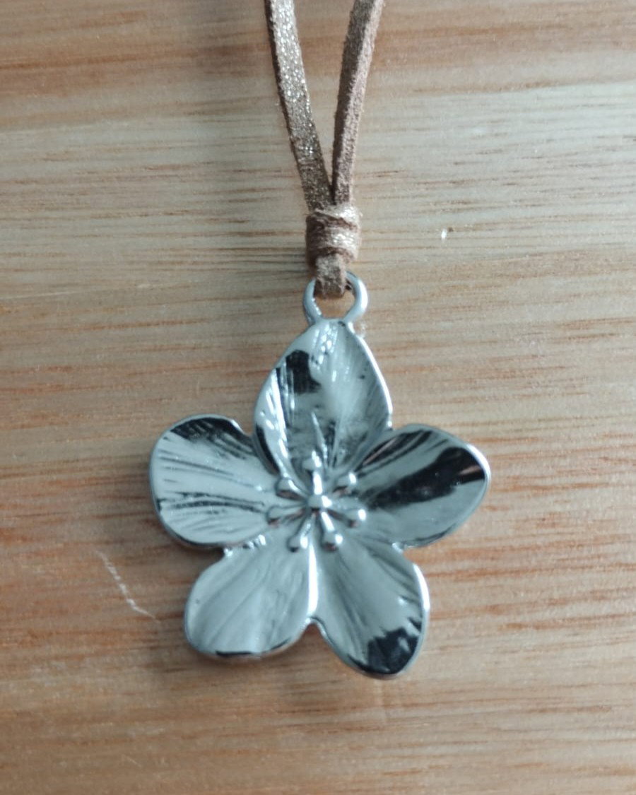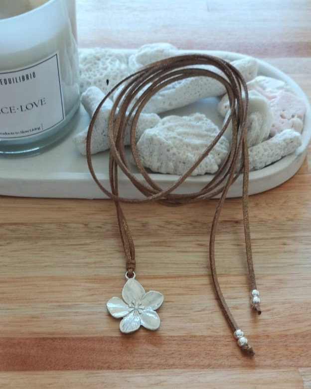 Collar de mútiples vueltas de cordón gamuzado beige con glitter. Dije flor de fundición.
