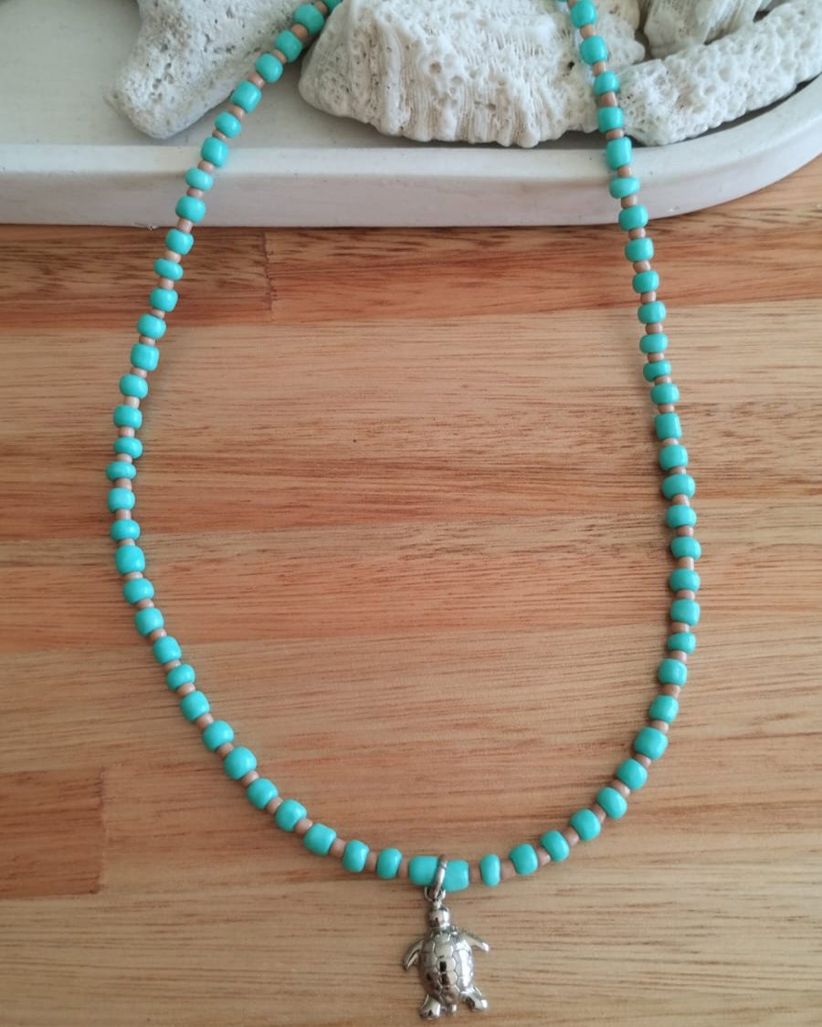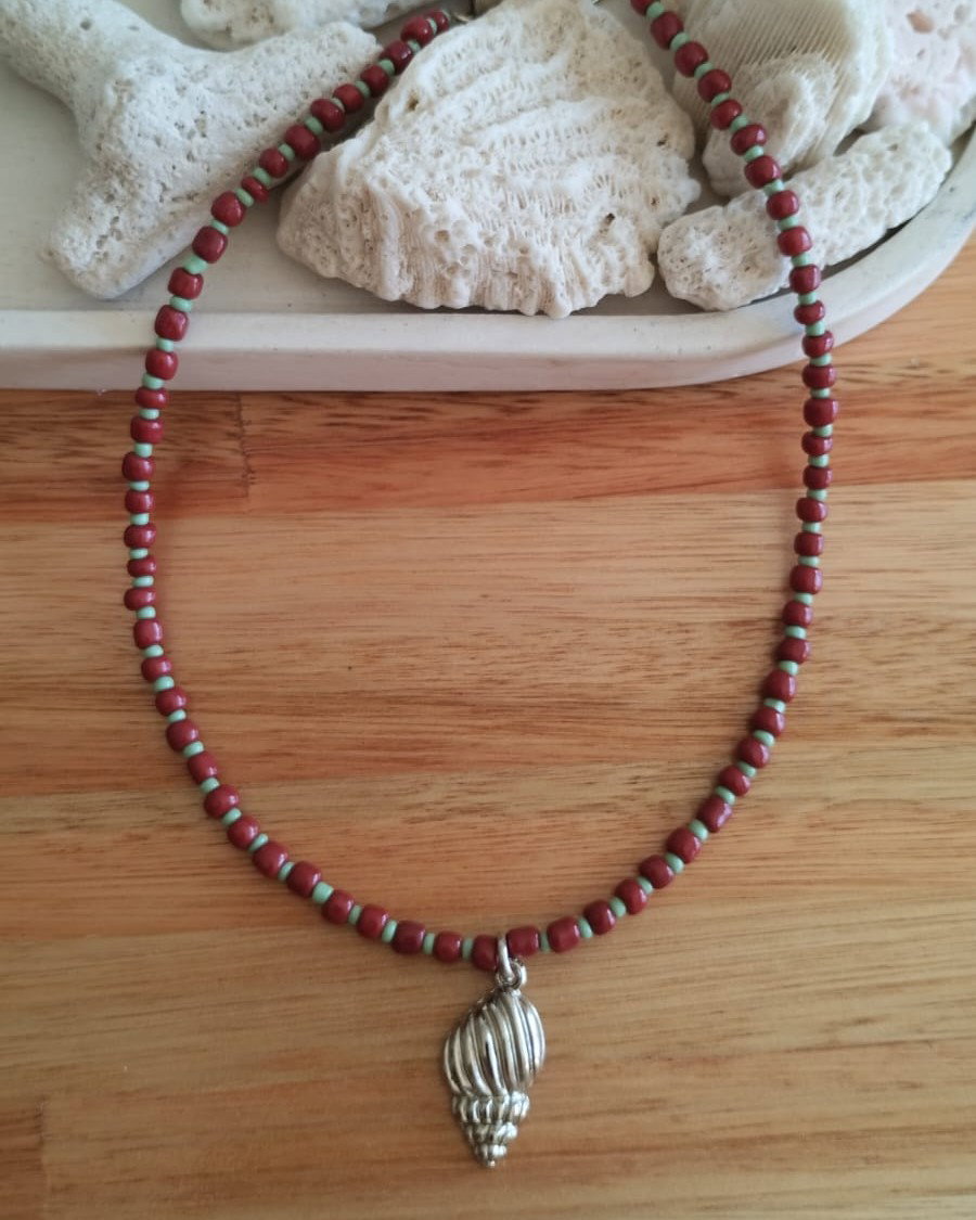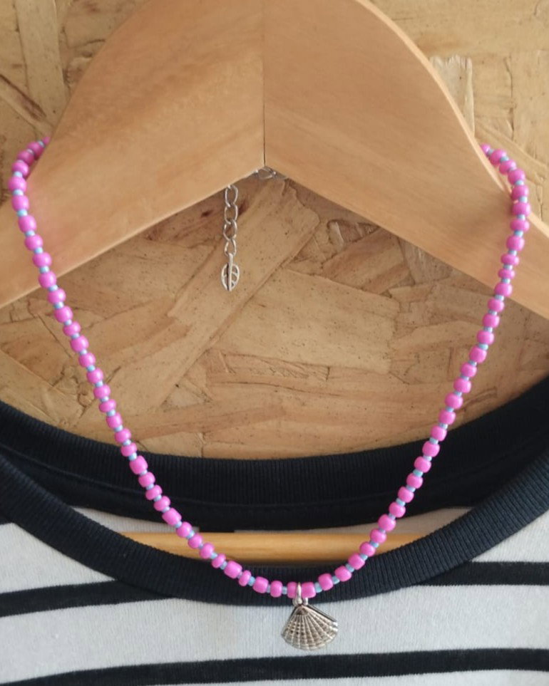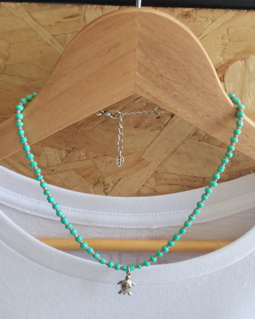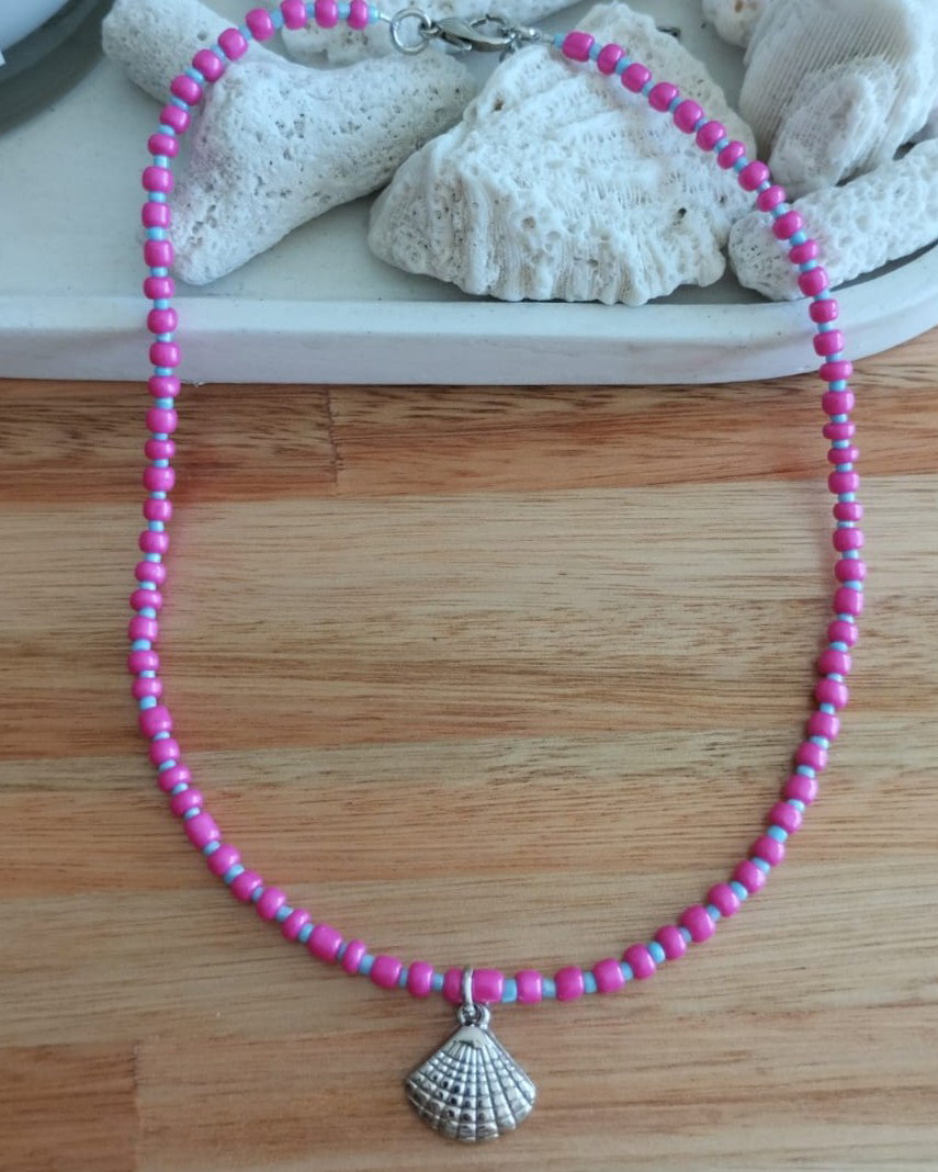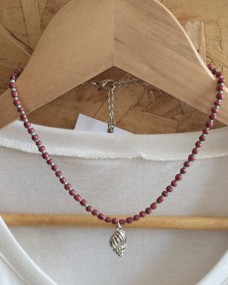 Collar corto de mostacillas grandes y pequeñas combinadas con dije de fundición. Viene con cadena de alargue.