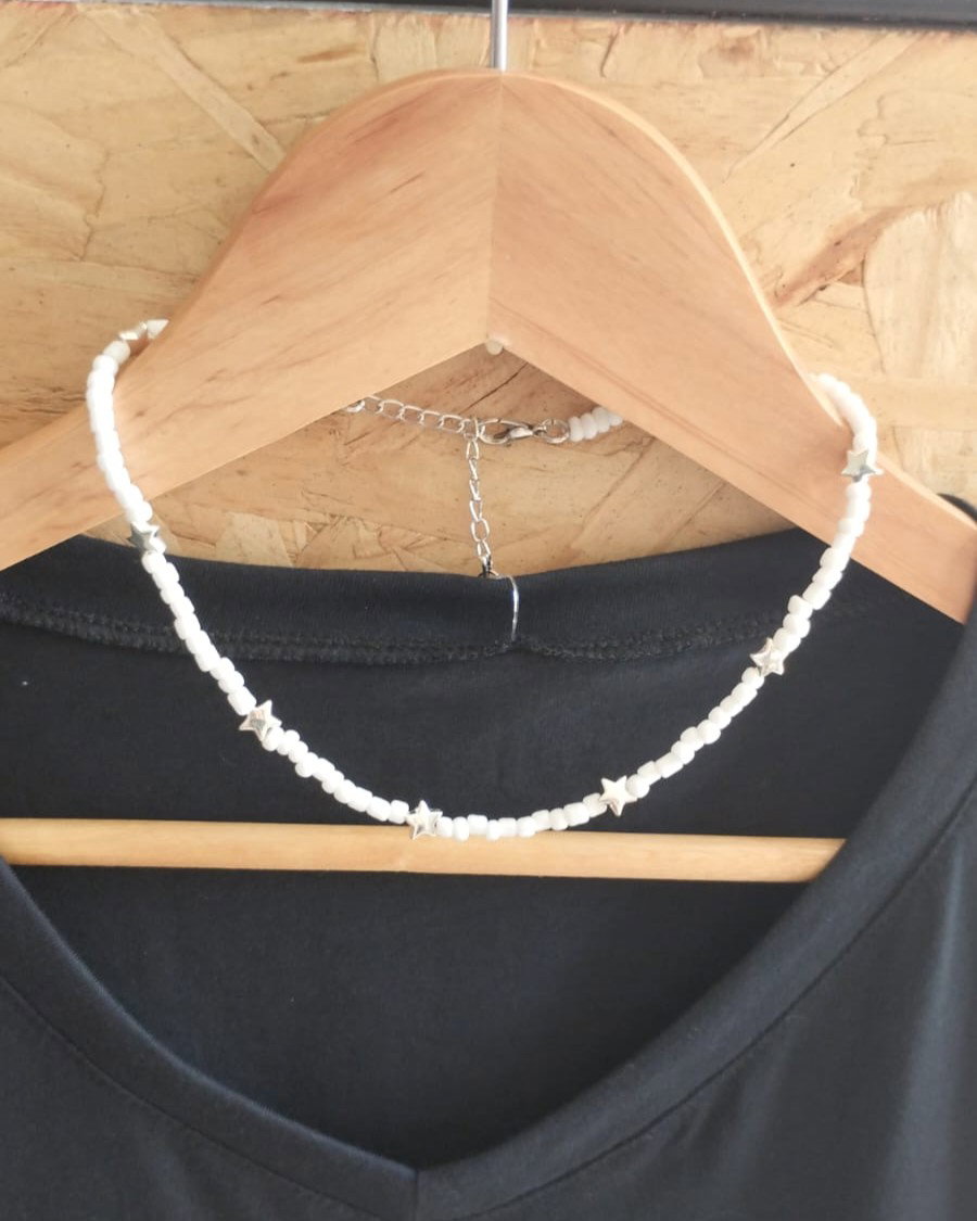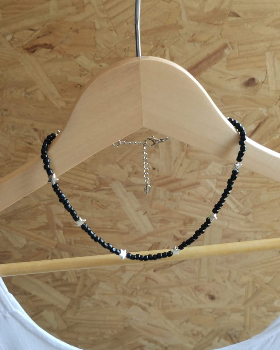 Collar corto de mostacillas grandes y estrellas pasantes metalizadas. Viene con cadena de alargue.
