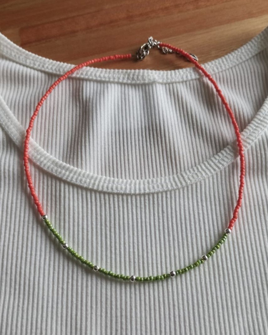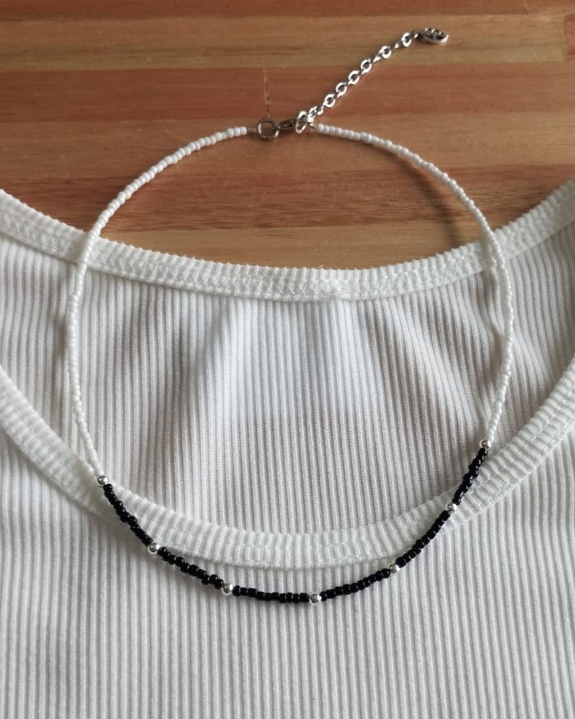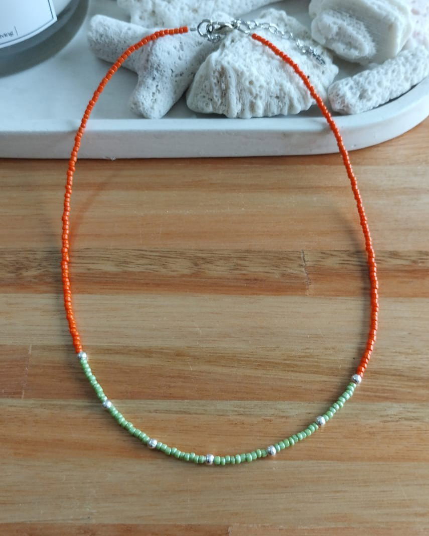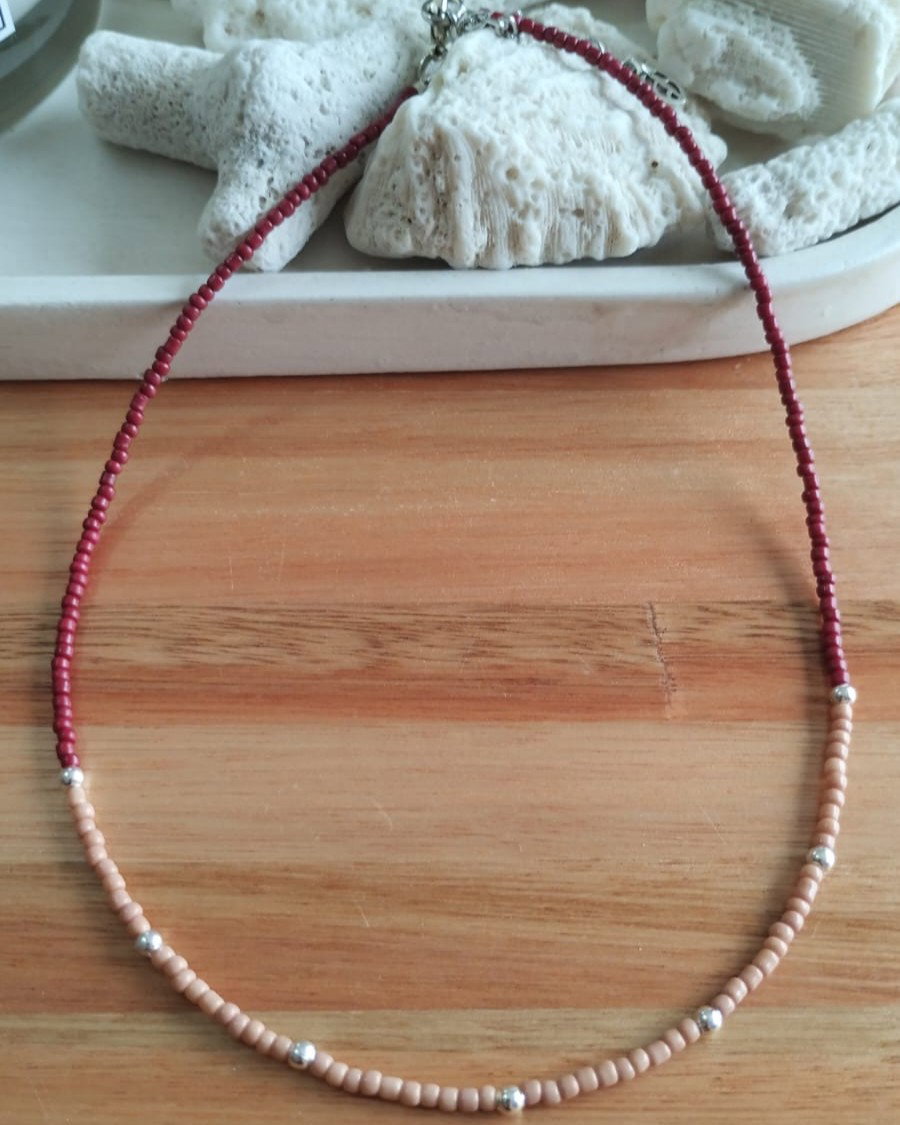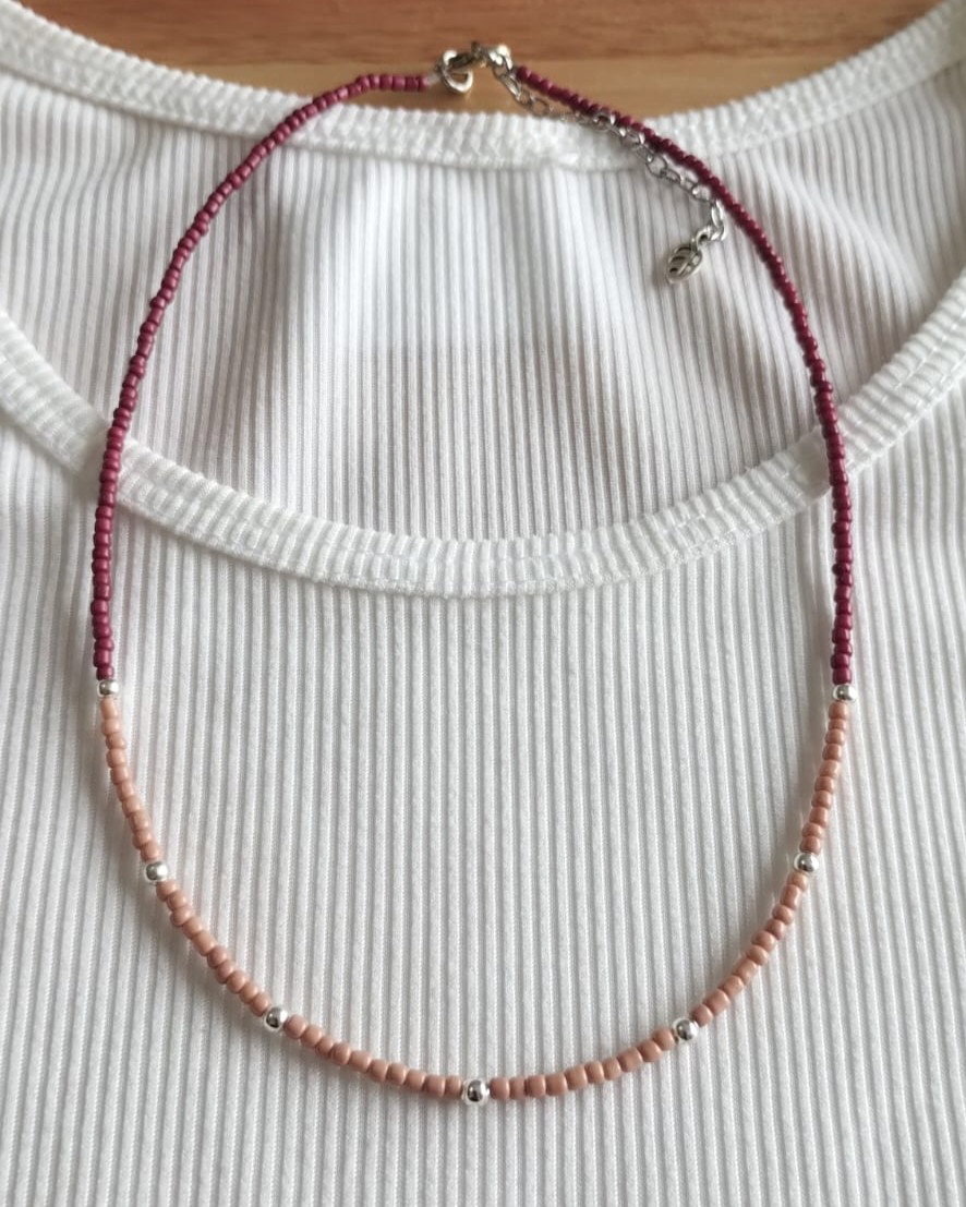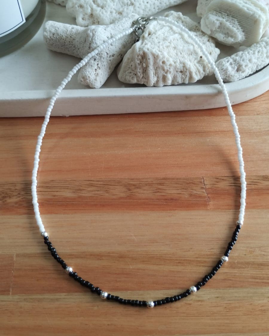 Collar corto de mostacillas pequeñas y bolitas metalizadas de niquel. Viene con cadena de alargue.