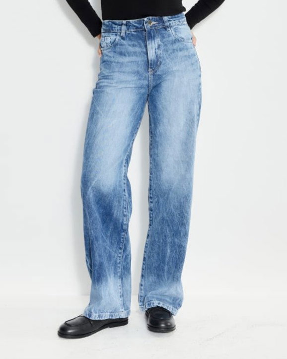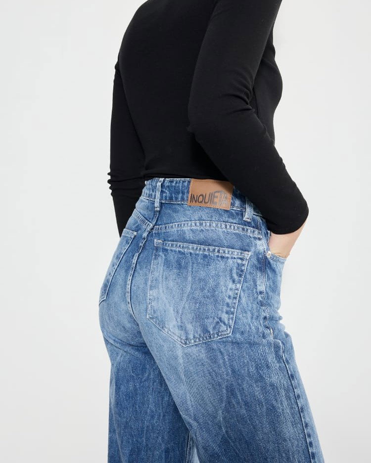 Jean recto denim rígido marca INQUIETA. Tiro alto con detalles en degradé.