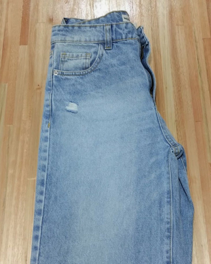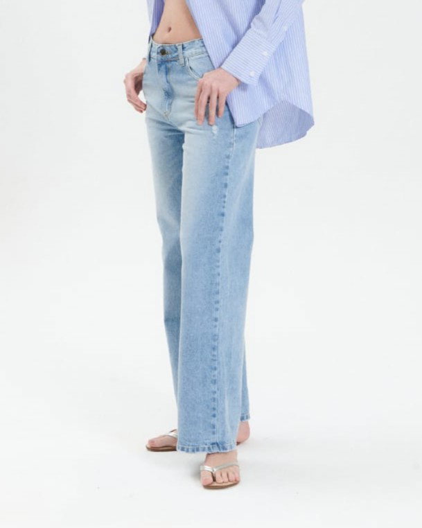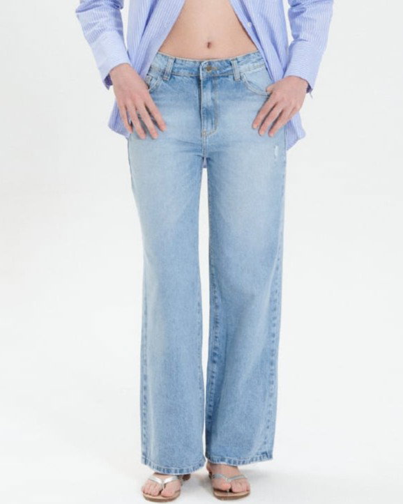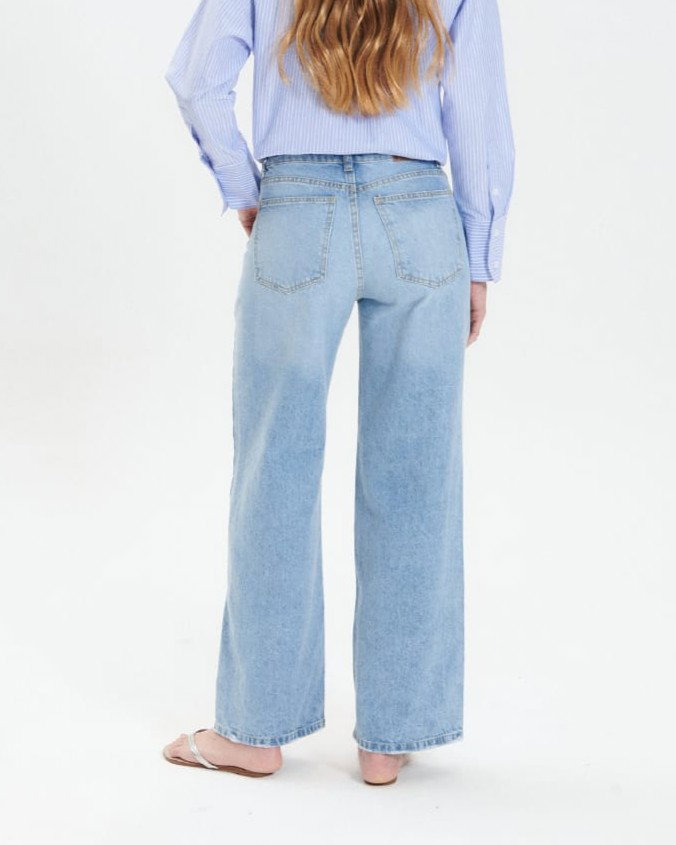 Jean wide leg tiro alto rígido en denim 100% algodón. Diseño holgado con piernas anchas. Clásico.