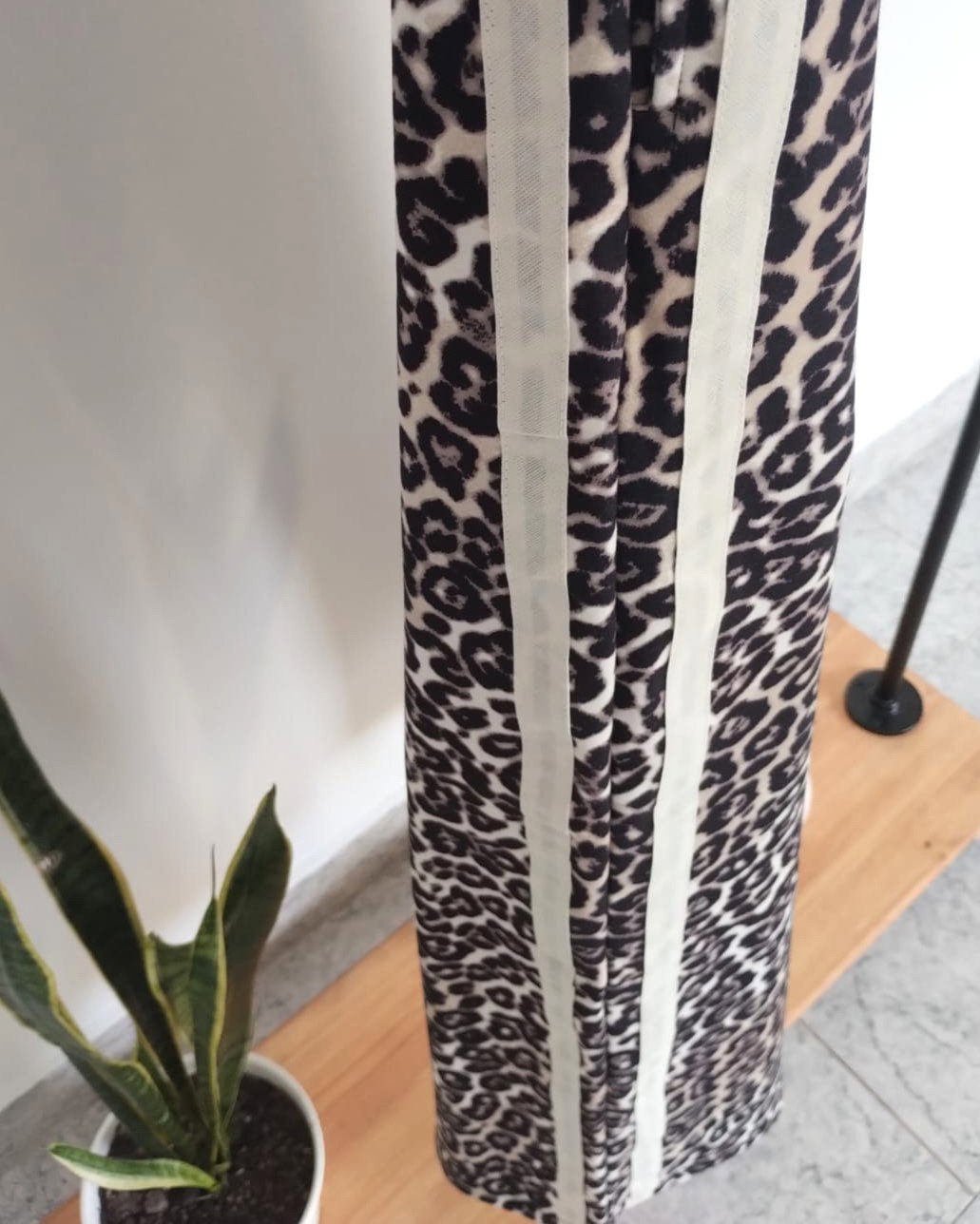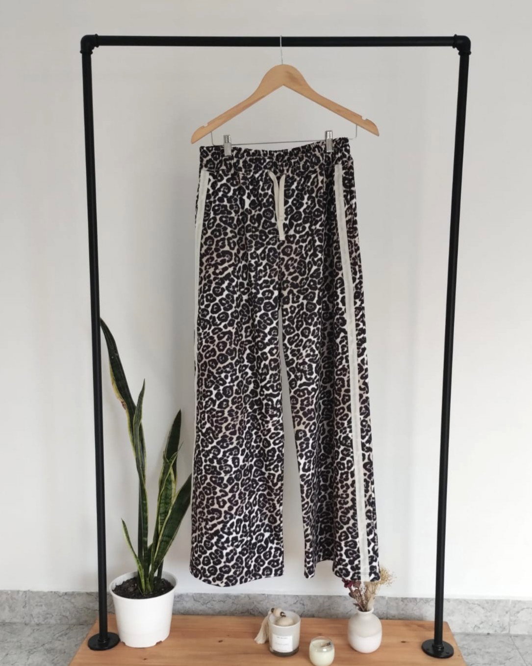 Pantalón palazzo estampado animal print con tiras blancas a los costados.