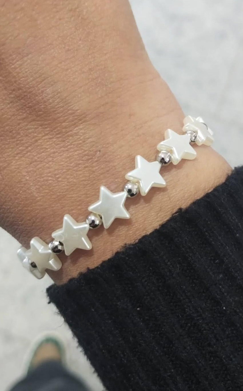Pulsera de estrellas perladas con bolitas de niquel. Nudo corredizo que permite ajustar el largo de la pulsera.