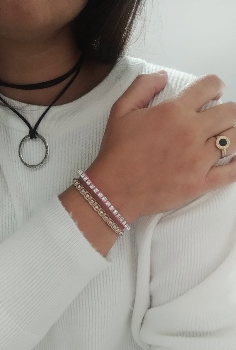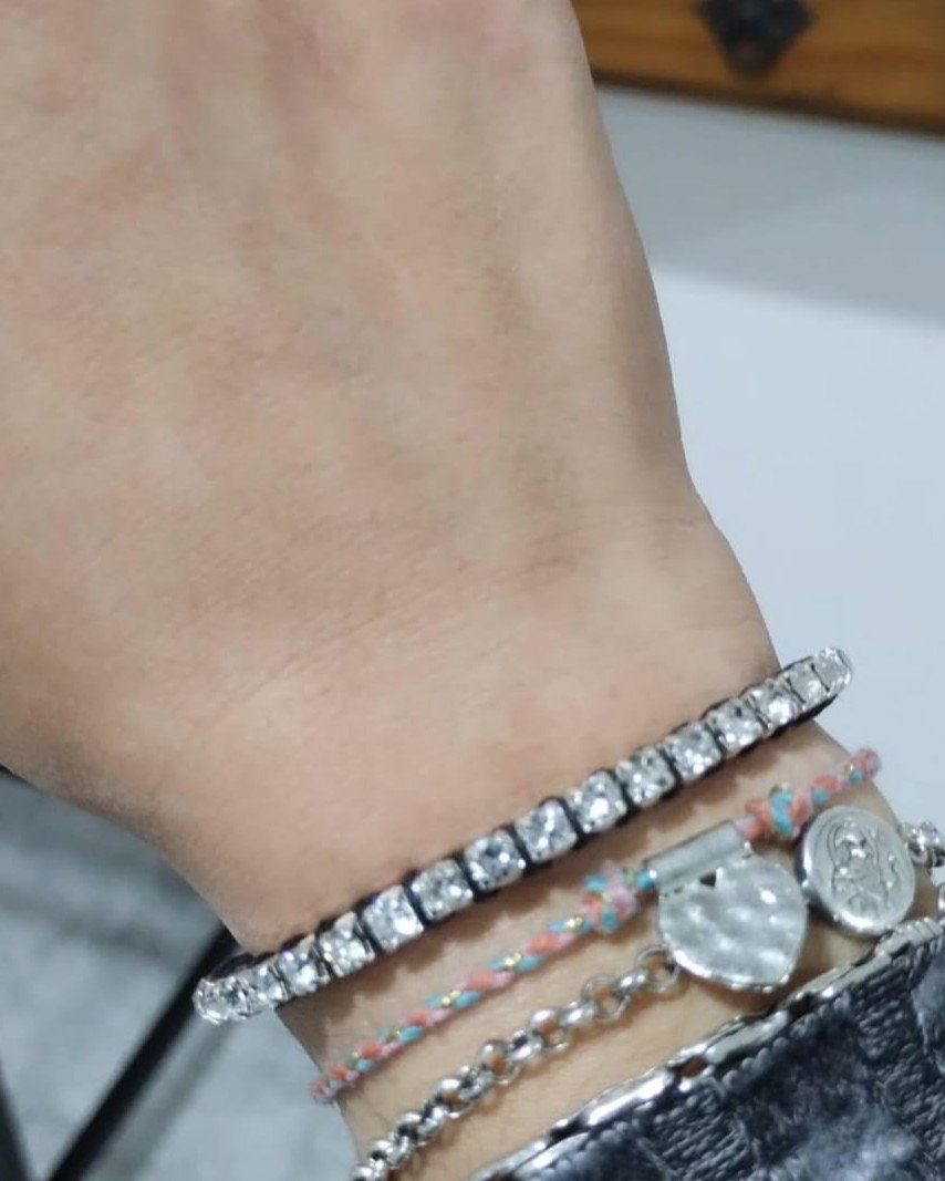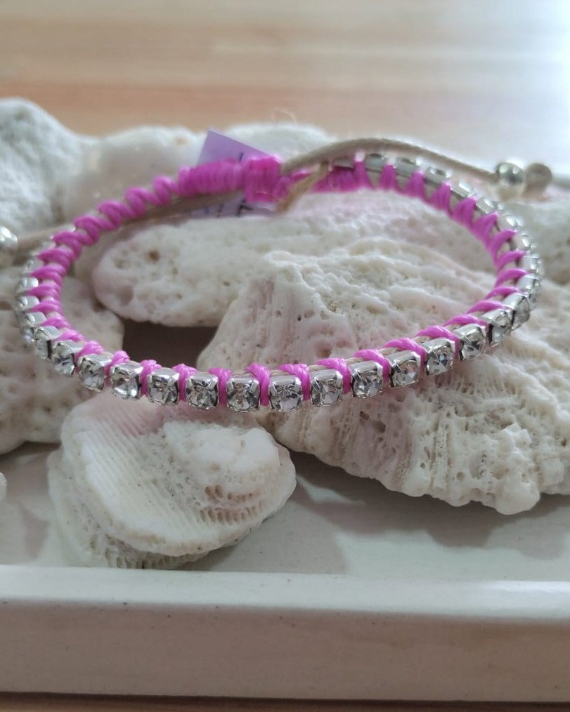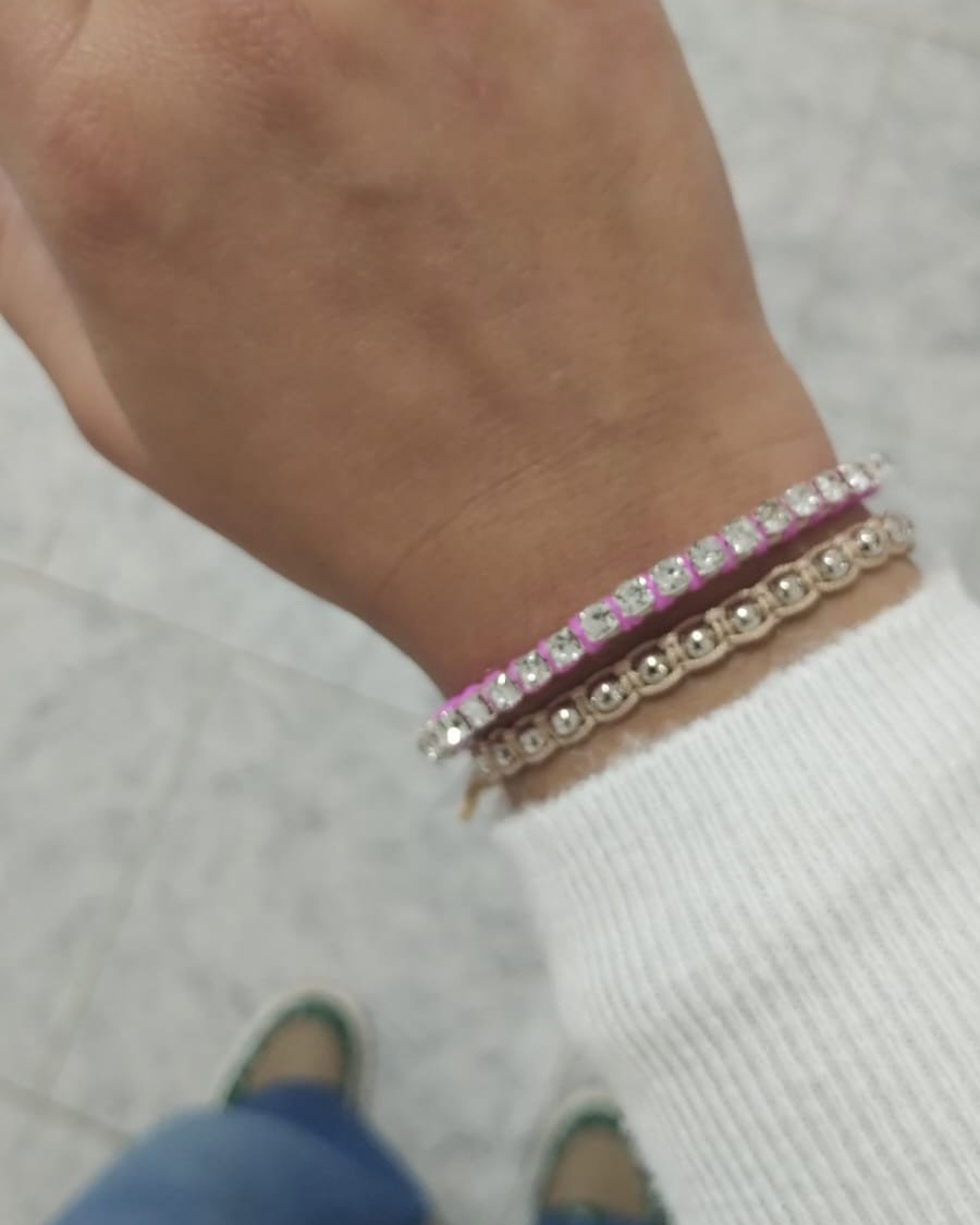 Pulsera de strass e hilo encerado, con cordón beige de base. Nudo corredizo que permite ajustar el largo de la pulsera.