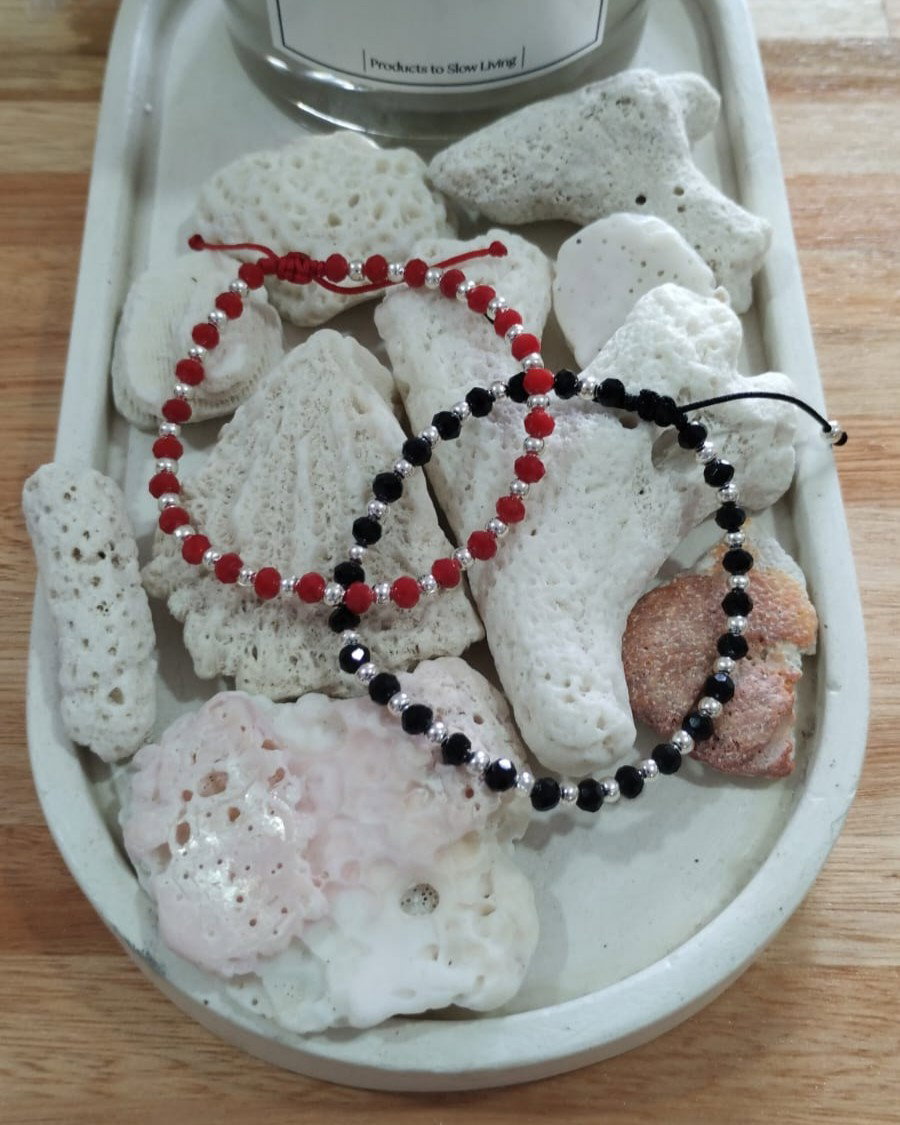 Pulsera con imitacíon de cristales de roca y bolitas de niquel. Realizada con hilo chino. Nudo regulable.
