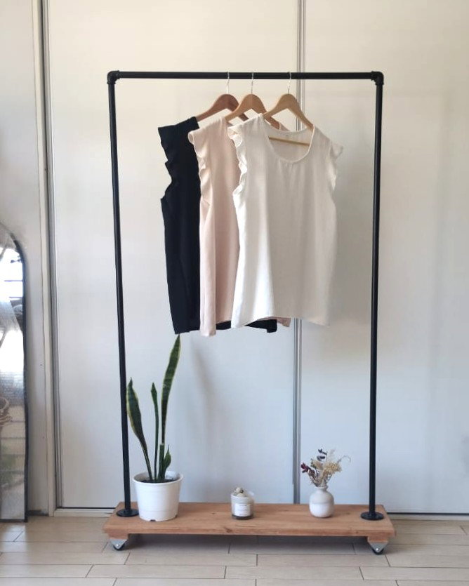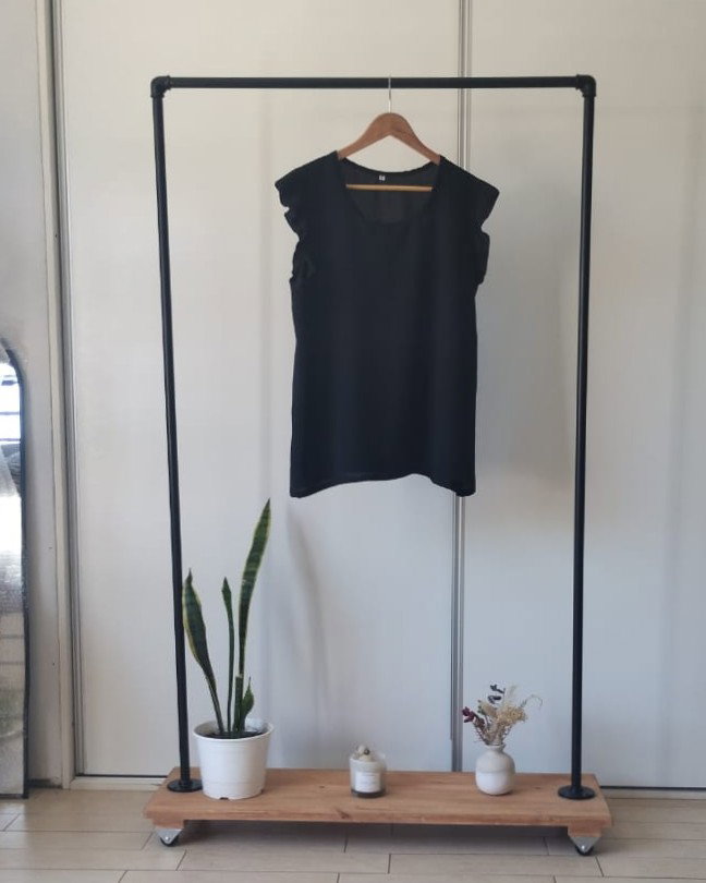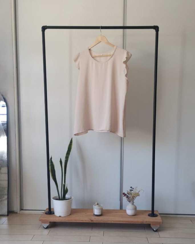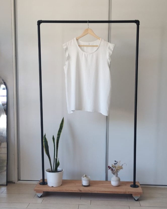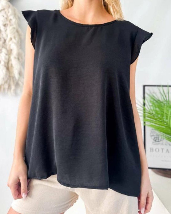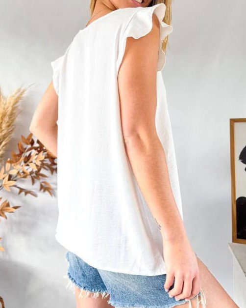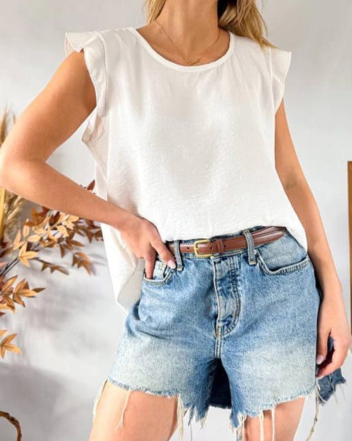 Remera de tela cey con volados en los hombros.