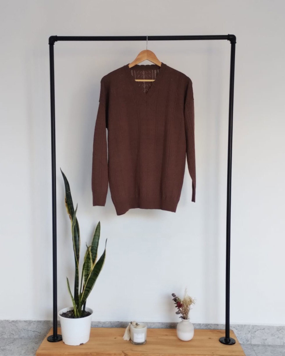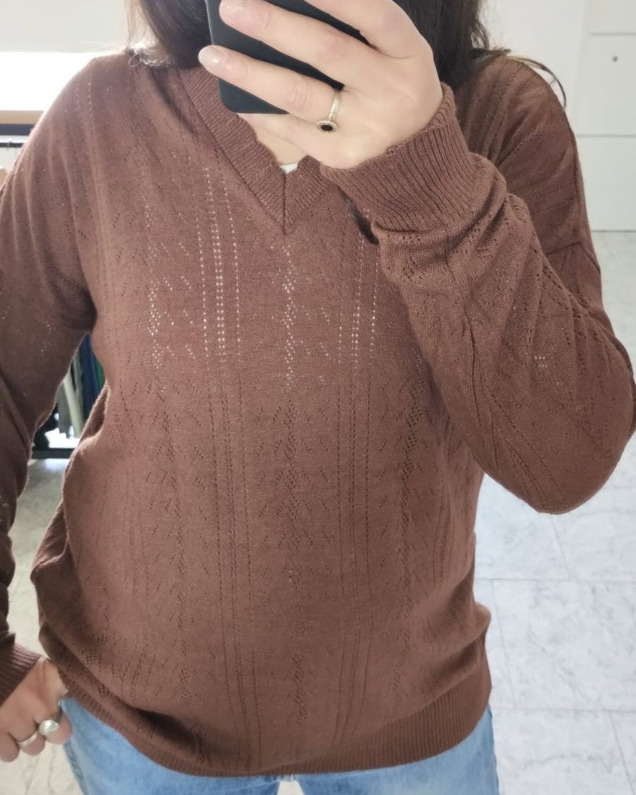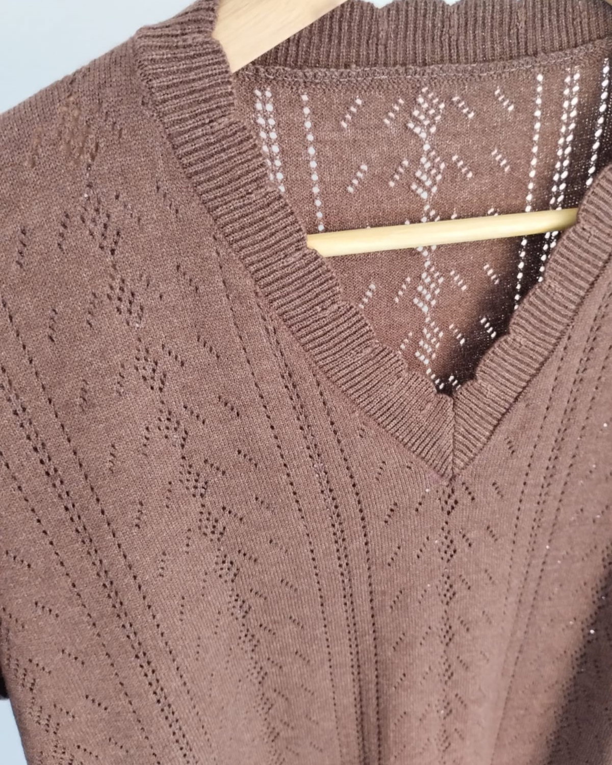 Sweater de hilo bremer, básico con escote V y detalles calados. Disponible en color marrón.